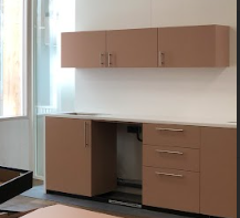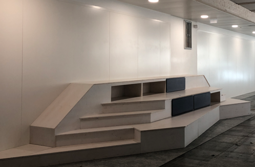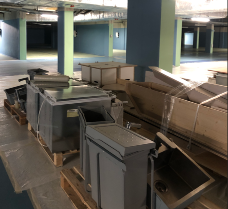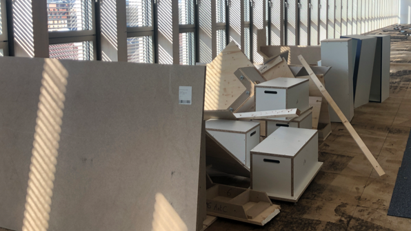 Matériaux collectés pour réemploi : tisanières-cuisines /poubelles de tri /suspensions / estrade / bibliothèques